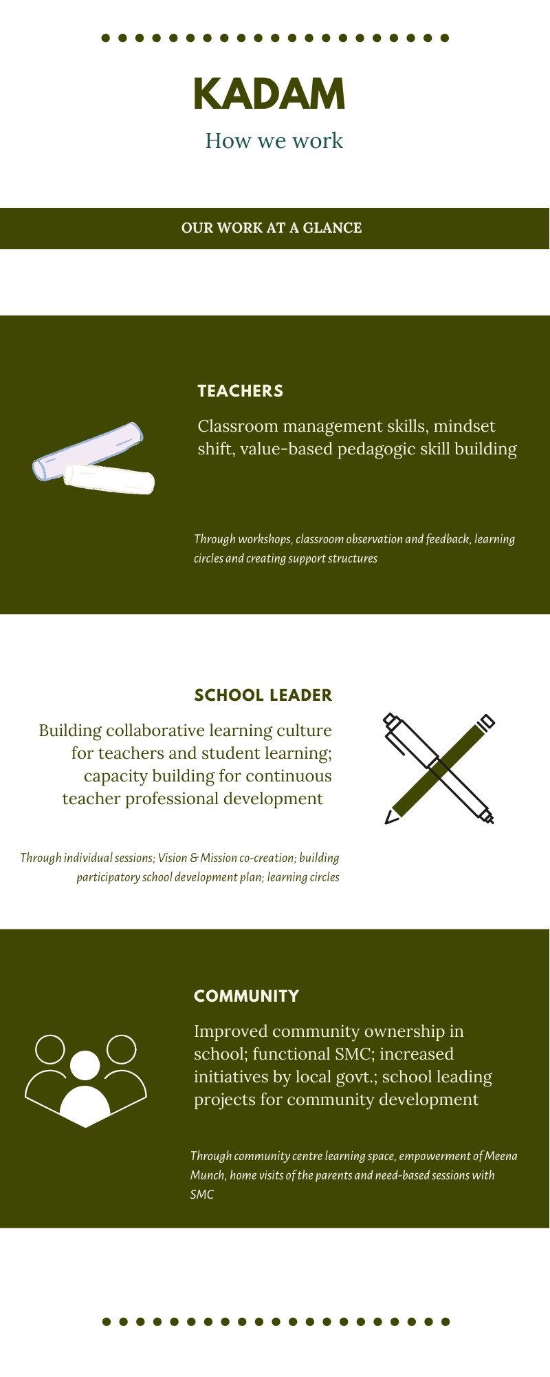 MGMD believes in the limitless potential of a child and considers this problem as a problem in the education system, therefore, envisions a systemic change; hence, we plan to work with teachers, the school leader and the community.
