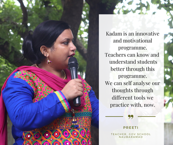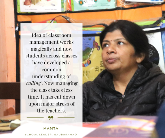 Simultaneously, we would work on building the capacity of the school leader to co-create the environment of learning. Our main aim would be to prepare the school leader to take it forwards after our exit from the school. Also, we involve and work with the community to align them on our activity happening in the schools. We provide the basic tools to the community so that they can support children to nurture the life skills in them.